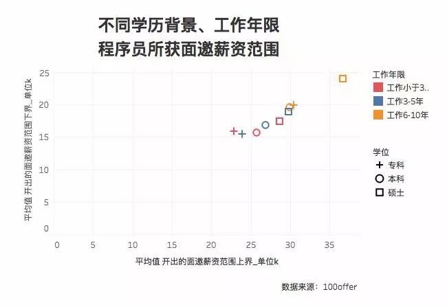 100offer 把平台上对候选人开出的面邀薪资平均上限和下限分别作为 X、Y 轴,把不同学历背景和工作年限的候选人在这个图上进行标记,不同学历背景的候选人收获的面邀薪资平均数表现如下: