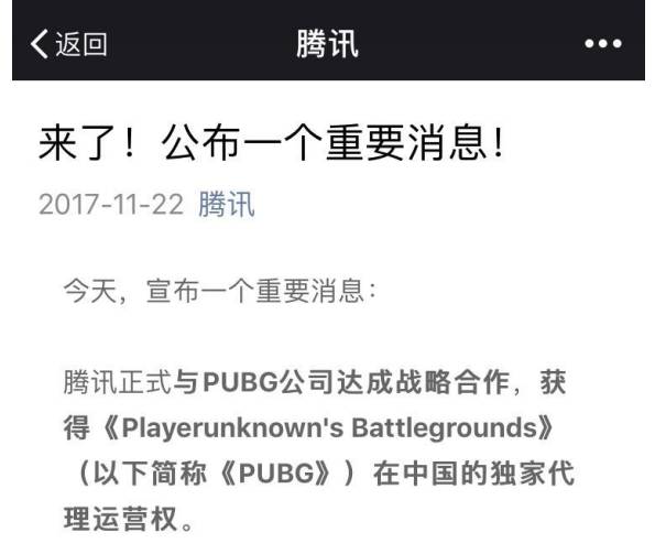 今天中午,腾讯以及腾讯游戏通过微信、微博等众多官方渠道公布,腾讯正式与PUBG公司达成战略合作,获得《Playerunknown's Battlegrounds》(以下简称《PUBG》)中国独家代理运营权。而《PUBG》在国内另一个名字,正是鼎鼎大名的《绝地求生:大逃杀》。