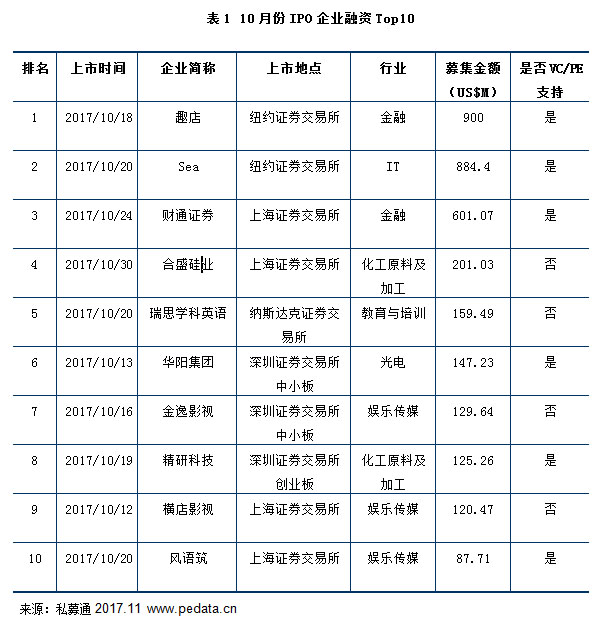 根据清科集团旗下私募通数据显示,2017年10月全球共有33家中国企业完成IPO,IPO数量环比减少23.26%,同比增加22.22%。中企IPO总融资额为34.56亿美元,融资额环比减少22.22%,同比减少52.17%。本月完成IPO的中企涉及14个一级行业,登陆6个交易市场,中企IPO平均融资额为1.05亿美元,单笔最高融资额9.00亿美元,最低融资额653.85万美元。33家IPO企业中19家企业有VC/PE支持,占比57.58%。本月金额最大的三起IPO案例为:趣店上市(9.00亿美元),Sea上市(8.84亿美元),财通证券上市(6.01亿美元)。