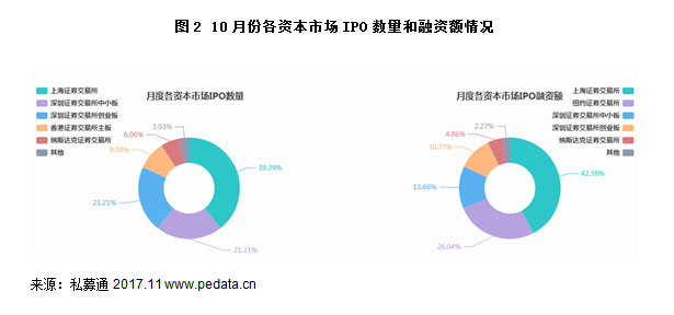 10月份共有33家主营地在中国大陆的企业上市。其中:上海证券交易所13家,占比39.39%;深圳创业板7家,占比21.21%;深圳中小板7家,占比21.21%;香港证券交易所主板3家,占比9.09%;纳斯达克证券交易所2家,占比6.06%;其他1家,占比3.03%。