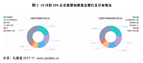 根据清科私募通数据统计:10月中企IPO共涉及14个一级行业,从案例数来看,机械制造、化工原料及加工、其他分列前三位,分别完成7、5和4个案例;占比依次为21.88%、15.62%和12.50%;累计占比50.00%。从金额方面来看,金融、化工原料及加工、机械制造分列前三位,募集金额分别为6.01亿、4.44亿和3.26亿美元,占比依次为23.52%、17.39%和12.78%;累计占比53.68%。
