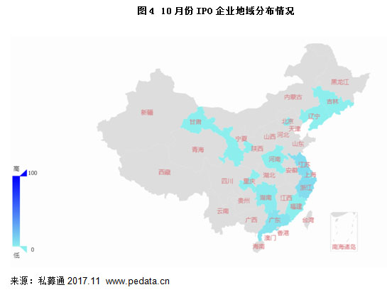 根据清科私募通数据统计:10月中企IPO企业共涉及12个省,从总数来看,浙江省、江苏省、广东省分列前三位,各完成IPO 8、7和5家企业;分别占比24.24%、21.21%和15.15%;其中有VC/PE支持的企业共19家,浙江省、江苏省、广东省分列前三位,分别中企IPO 5、5、2家,分别占比26.32%、26.32%、10.53%。