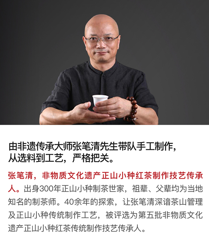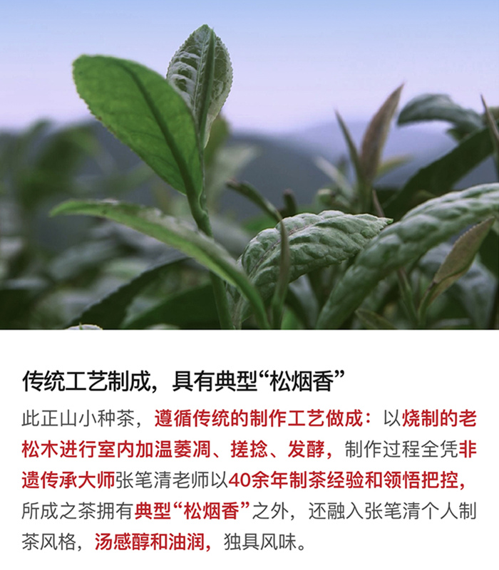 于春季采摘标准一芽二三叶,遵传统工艺,以烧制的老松木进行室内加温萎凋、搓捻、发酵,拥有典型“松烟香”,滋味甜醇细柔,十分悦人。