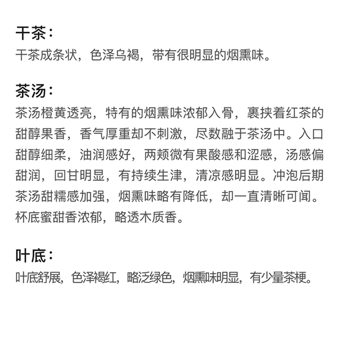 拥有典型“松烟香”,滋味甜醇细柔,十分悦人。