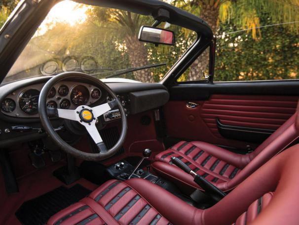 这辆法拉利Dino 246 GTS是1974年生产的第5辆车,底盘编号08500。使用了罕见的“Chairs and Flares”选项配置,包括7 英寸砂模铸造的Campagnolo轮圈、更宽的Group 4赛车风格挡泥板、Daytona座椅,意指法拉利365 GTB/4的豪华,还有可选的空调和电动车窗和收音机。于1974年出售后在内的一连串车主都很谨慎地使用了这辆车,现里程表读数为1.9万英里,保存了原始的工厂工具包、书籍和服务记录。