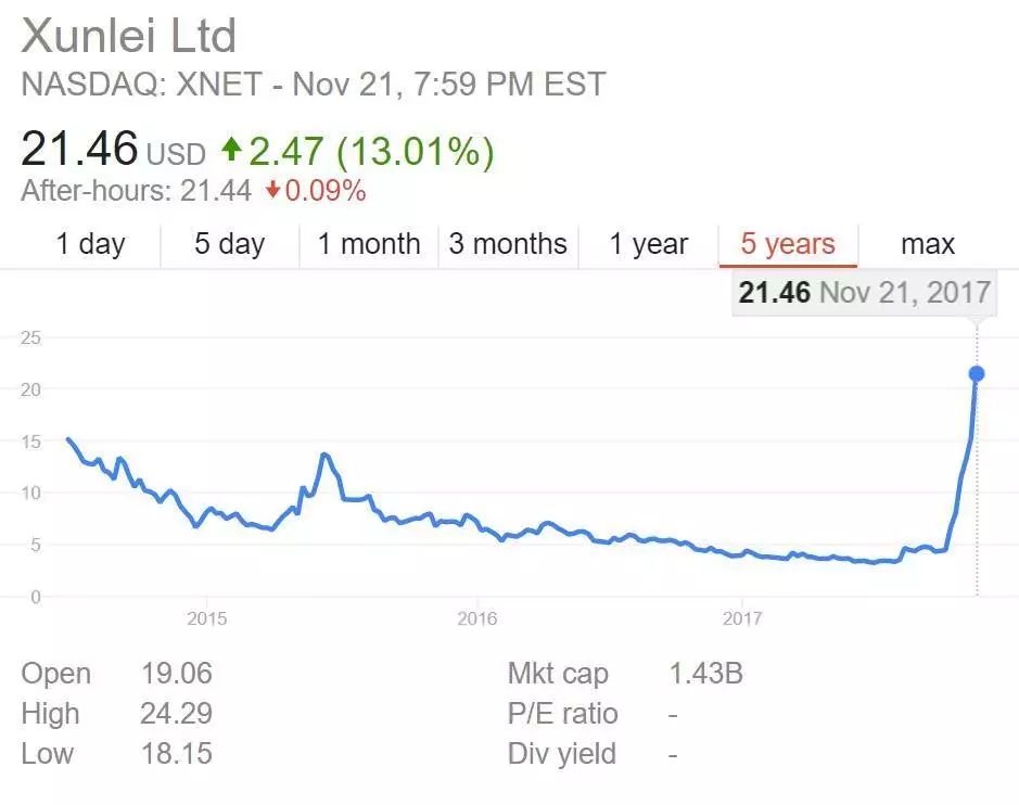 近一段时间,迅雷在美股市场的表现令人惊异。10月12日,迅雷每股价格4.31美元,而截至美东时间11月21日,迅雷股价已经达到每股21.46美元,40余天暴涨近5倍,涨幅达到398%。