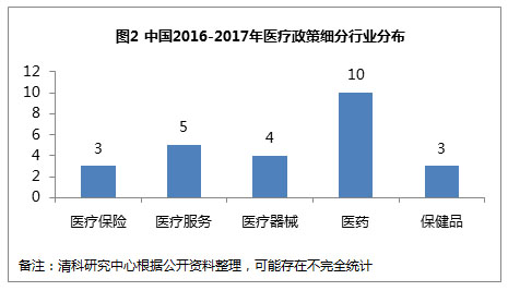 根据清科研究中心不完全统计,2016-2017年上半年,中国共出台23项政策,覆盖医疗保险、医疗服务、医疗器械、医药及保健品五大领域,其中以医药领域政策出台最为密集,改革力度大,政策重点方向主要为鼓励研发,降低成本,简化审批程序,开放电商平台,其中尤以2016年12月26日国家卫生计生委出台《关于在公立医疗机构药品采购中推行“两票制”的实施意见(试行)的通知》影响面最大,主要推动在公立医疗机构药品采购中落实“两票制”,规范药品流通秩序、压缩流通环节、降低虚高药价。