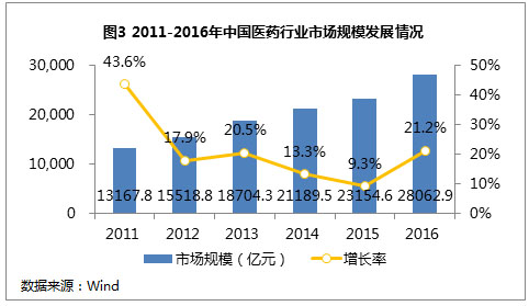 医药:市场规模近3万亿,互联网+及两票制的出台,深刻影响传统医药产业链 在医疗健康行业细分领域中,医药行业市场份额占据了半壁江山。医药主要包括化学原料药及制剂、中药材和中药饮片、中成药、抗生素、生物制品和生化药品、放射性药品、卫生材料等多个门类,其中化学制药是医药行业细分领域龙头行业,中国制药企业中绝大多数都化学制药企业。受监管政策趋紧的影响,2012至2015年间,我国医药市场增长速度逐渐放缓。2016年出台多项政策促进了医药行业的发展,市场规模增长率有大幅上升,医药行业市场有所回温。