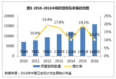 受上述系列政策红利的影响,民营医院数量年增长率保持在10%以上,呈现井喷式发展。特别是2015年,我国民营医院增长速度达19.3%,民营医院数量正式超过公立医院,成为国内医疗服务发展的一大变革节点。随着支持民营医院发展政策的进一步深入贯彻落实,社会资本不断涌入医疗市场,民营医院将迎来更大规模的发展。
