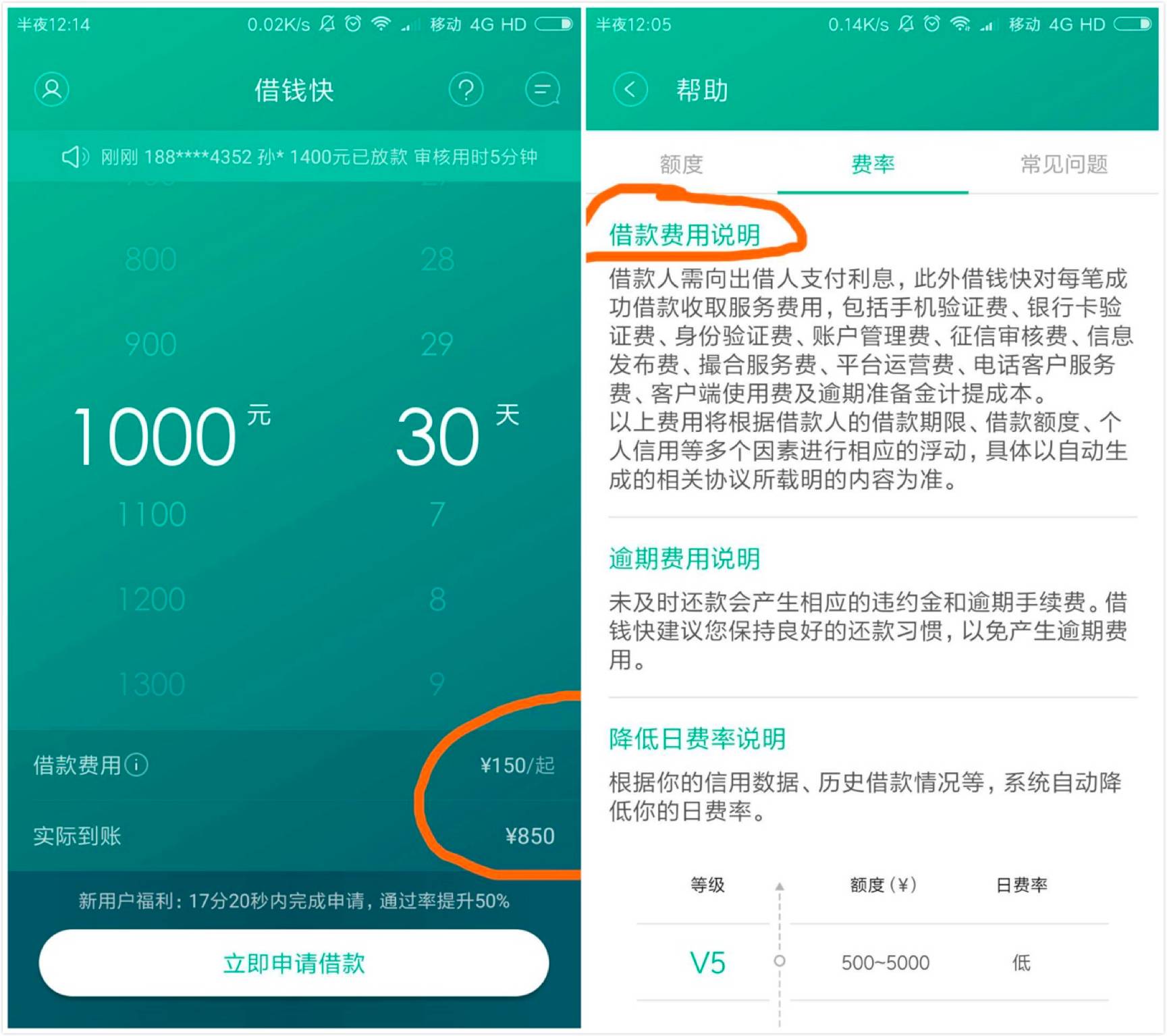 借款人在借钱快App上以30天为还款期限借款1000元时,扣除琳琅满目的借款费用150元后,实际到账只有850元。照此计算,月利率为15%,年利率则达到180%。一家现金贷平台的相关负责人向独角金融透露,“现在这一行业的综合借款利率都很高,年化利率500%其实都很平常了,甚至还有更高的”这明显远超36%红线。