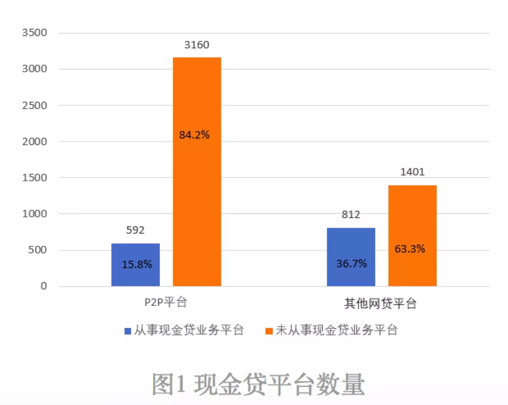 校园贷遭受“一刀切”,但却不影响其他市场中现金贷的迅猛发展。据国家互金专委会数据统计,截至2017年11月19日,市场上在运营的现金贷平台为2693家。其中,开展现金贷业务的平台中,有592家是P2P网络借贷平台,约占全部P2P平台总数的15.8%;有812家是其他网贷平台,约占全部其他网贷平台总数的36.9%。