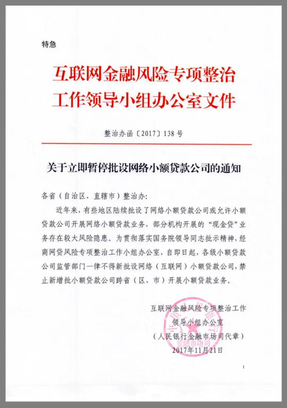 11月21日,芝麻信用终止与部分现金贷平台合作的消息传出。同日,互联网金融风险专项整治工作领导小组办公室下发暂停审批网络小贷牌照的文件,直指“现金贷”业务的风险隐患,这被认为是现金贷监管全面落地前的风暴。