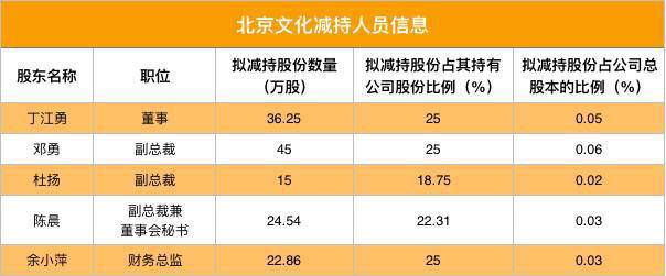 但是在8月7日的时候,北京文化发布公告称,公司董事、高级管理人员拟计划未来6个月内通过证券交易所集中竞价或者大宗交易等方式减持公司股份合计不超过 1436.525万股(占公司总股本比例为 0.1978%)。