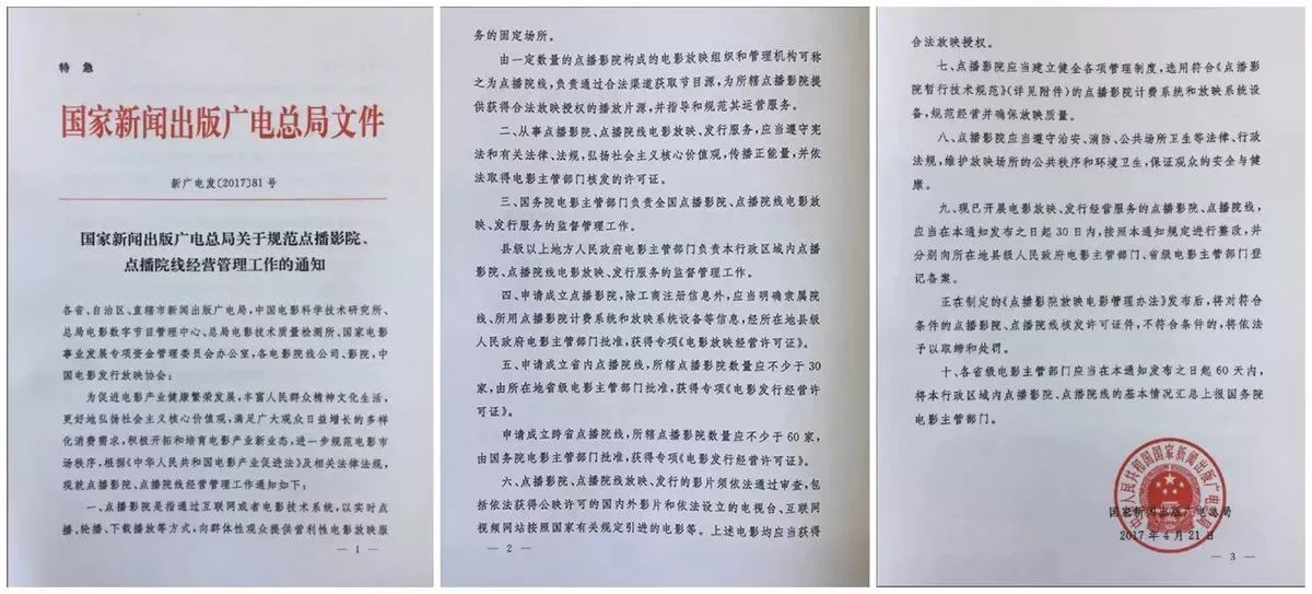 为了应对其快速发展,2017年上半年,广电两次针对点播影院发文,拟将原本处于野蛮生长的私人点播影院行业正式纳入正规渠道,并拟采用一级院线的管理办法对各点播院线进行管理。