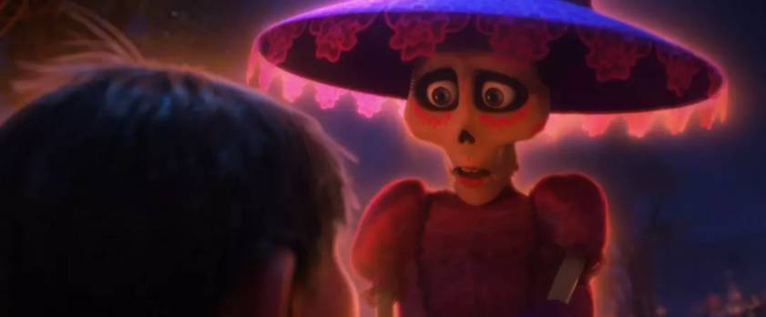 或许你会认为《寻梦环游记》又是一个老调俗套的「追梦」故事,但皮克斯很快在第二幕给予了我们充分的惊喜:在亡灵节(Día de los muertos)这一天,米格在无意中闯入了死后的世界,眼前的一切发生了天翻地覆的变化。他能看到周围的亡灵,自身也成为了独一无二的、「活着」的亡灵。