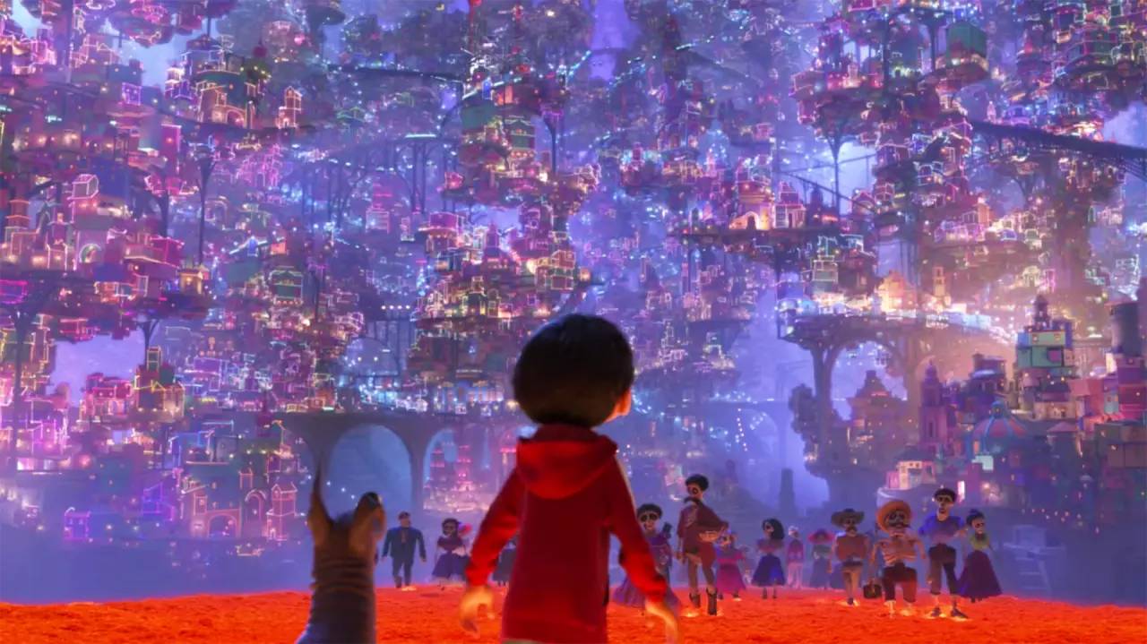 不同于我们通常对死后世界恐怖凄凉的想象,皮克斯借助小男孩米格的视角向我们展现了堪称电影史上最色彩绚丽的死后世界。这里灯火通明,整个世界笼罩着一层浪漫的紫色光芒,错落林立的高楼带给人仿佛时空交错之感,简直有如未来都市一般绚目迷人。
