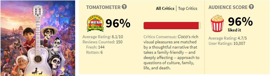 豆瓣网友对本片打出了9.4的高分,高于99%的动画!而影评网站烂番茄也对本片给出了96%的超高新鲜度,可以说在大众眼中本片已经达到皮克斯巅峰档的水准,直逼《头脑特工队》。皮克斯的影迷们都在欢呼着:当年那个皮克斯又回来了!