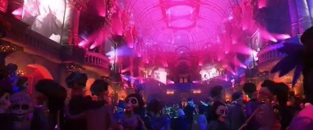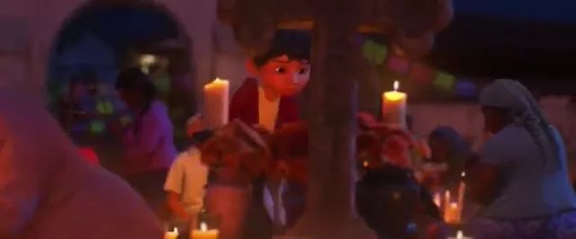 片中的骷髅们并不可怖,反而是盛装打扮,结着伴畅笑欢谈,这与之前墓地场景中活人们为逝去亲人祭拜祈福时那肃穆、忧伤的气氛形成了剧烈的反差。在经历第一幕的压抑过后,片中的亡灵世界反而比现实世界更显得颇具生机和活力,使我们更容易对这一世界产生认同。