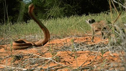 眼镜蛇特工因其独特的伸缩性能唬住了呆萌的狐獴。
