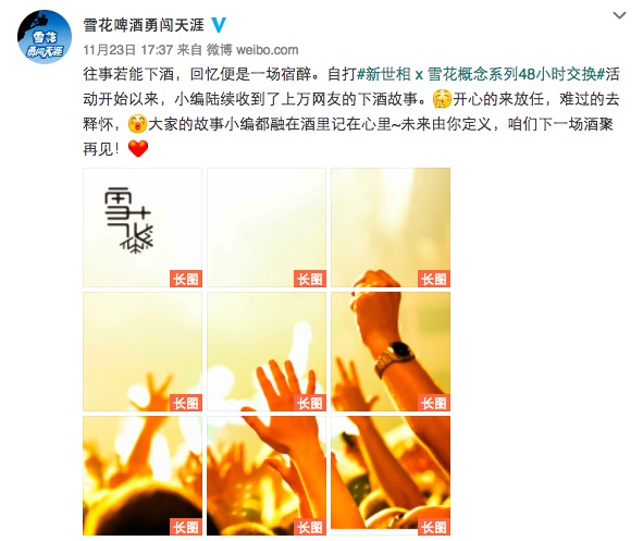 而擅长用文艺情感类话题展开讨论的新世相也加入了和雪花啤酒的合作,发起了一个“新世相X雪花概念系列48小时交换”的活动,征集网友们的下酒故事。