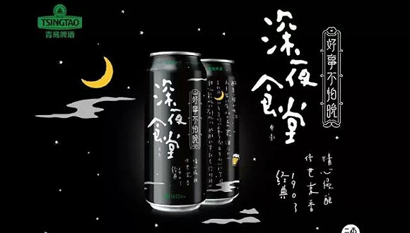 但如今不少国产啤酒品牌希望从营销上带来突破。比如青岛啤酒也看上了“年轻人深夜喝酒”这个场景,推出了和电影《深夜食堂》的定制版包装:和过去调性完全不同的黑色罐,印着“深夜食堂”的logo和手写体文字。在这之前,它还和肯德基合作,推出过“闻鸡起舞”的定制版啤酒,在制造春节气氛的同时,玩了一把年轻人热衷的“炸鸡配啤酒”梗。