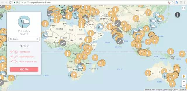 因此Hakkens在网站上做了一款地图,任何已经成功运作的塑料加工坊、或者懂制造机器技术、有场地、会产品设计的人,都可以在网站地图上提交标签。