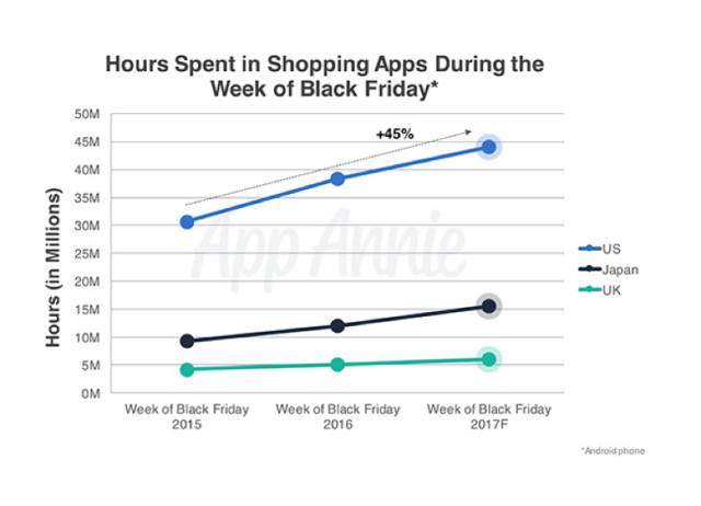 随着应用程序带来的来自移动端的购物收入增加,App Annie相信2017年的黑色星期五将成为全美国有史以来最大的手机购物日。