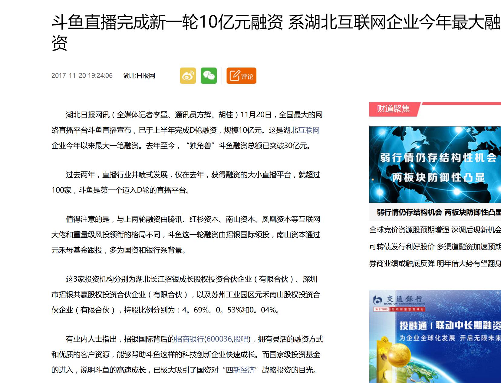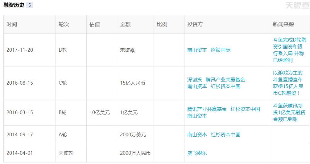 11月20日,斗鱼直播宣布于2017年上半年完成D轮融资。此次融资由招银国际领投,南山资本跟投。在宣布完成D轮融资的同时,斗鱼对外表示公司完全进入盈利状态,并在积极对外投资。