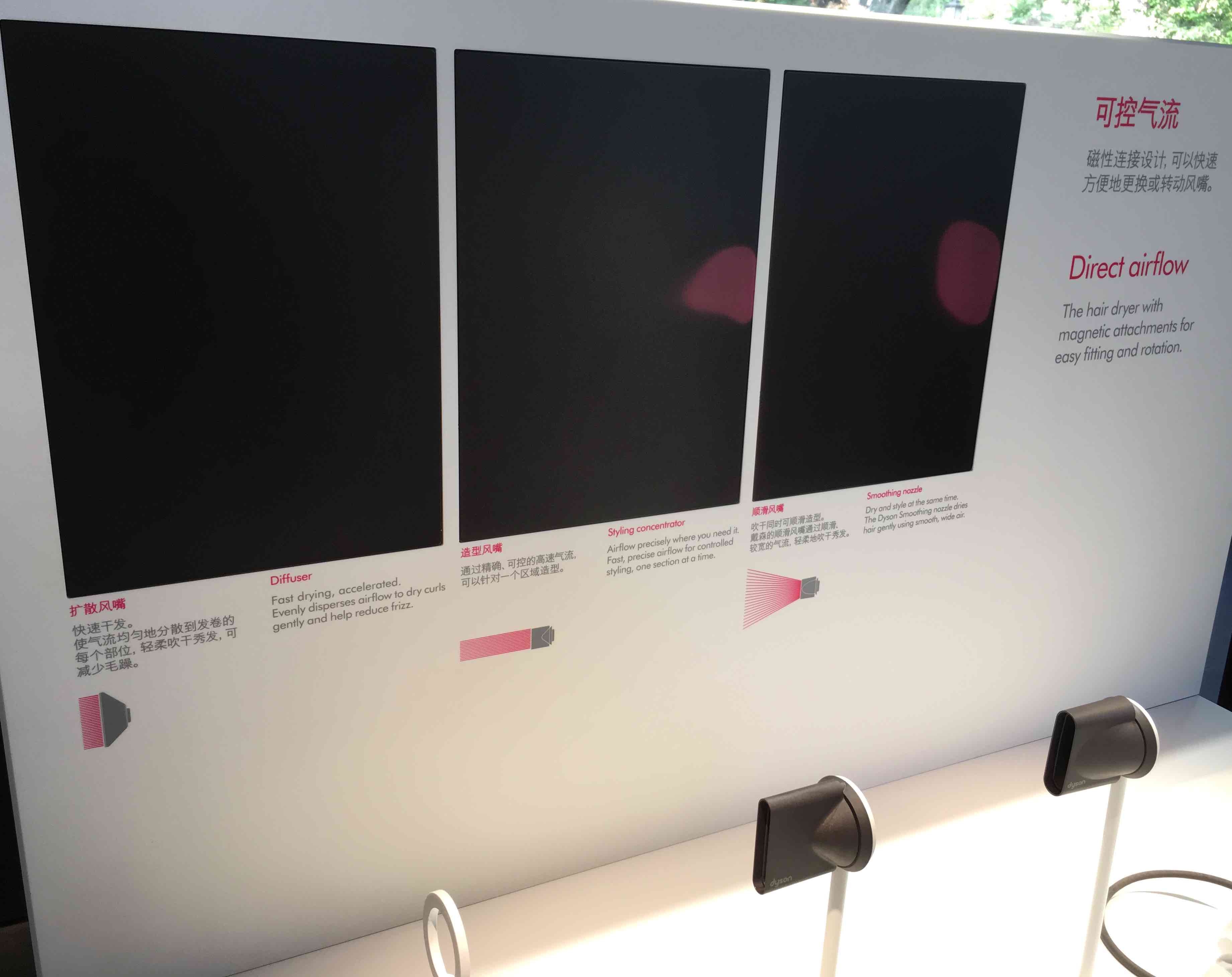 在戴森的最新的Demo Store中,可以看到,戴森准备了多种灰尘样品和多种地板类型用来测试戴森吸尘器。在吹风机的展示台前,戴森设置了一种对气流敏感的传感面板来展示不同的风嘴产生的气流变化。