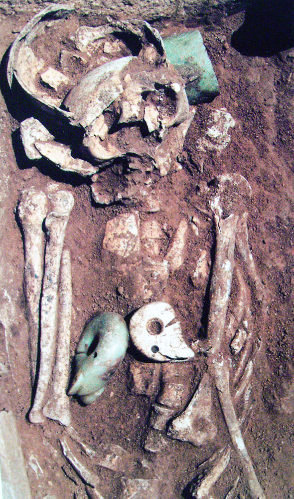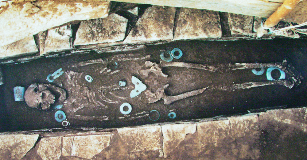 当时,他带着两个民工对五号墓葬进行清理。墓已经挖开了,被石板盖住。石板抬出后,邓茂下到墓葬的最下面进行清理,两个民工在上面清土。墓地是南北朝向,石棺内卧有一成年男性。尸骨保存完好。他从脚部开始清理。在人骨的右腕处,有一只深绿色的半透明的玉镯。人骨的右耳处,有一只一面绿色一面黑色的绿松石耳坠。他又在左耳处查找另一只,刨了半天,没有刨到。