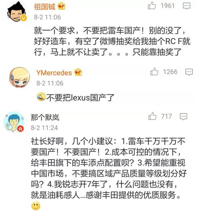 “最重要的是独立思考”——当年日系粉丝喜欢这样呛喜欢德系的群众,现在这句话其实可以反过来用在日系粉丝上。前几个月丰田章男刚开通微博,一大群日系粉丝聚在评论区表达诉求:请不要将雷克萨斯国产。