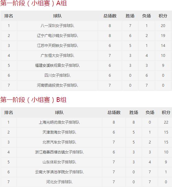 2017-18赛季中国女子排球超级联赛积分榜(截至2017年11月28日)