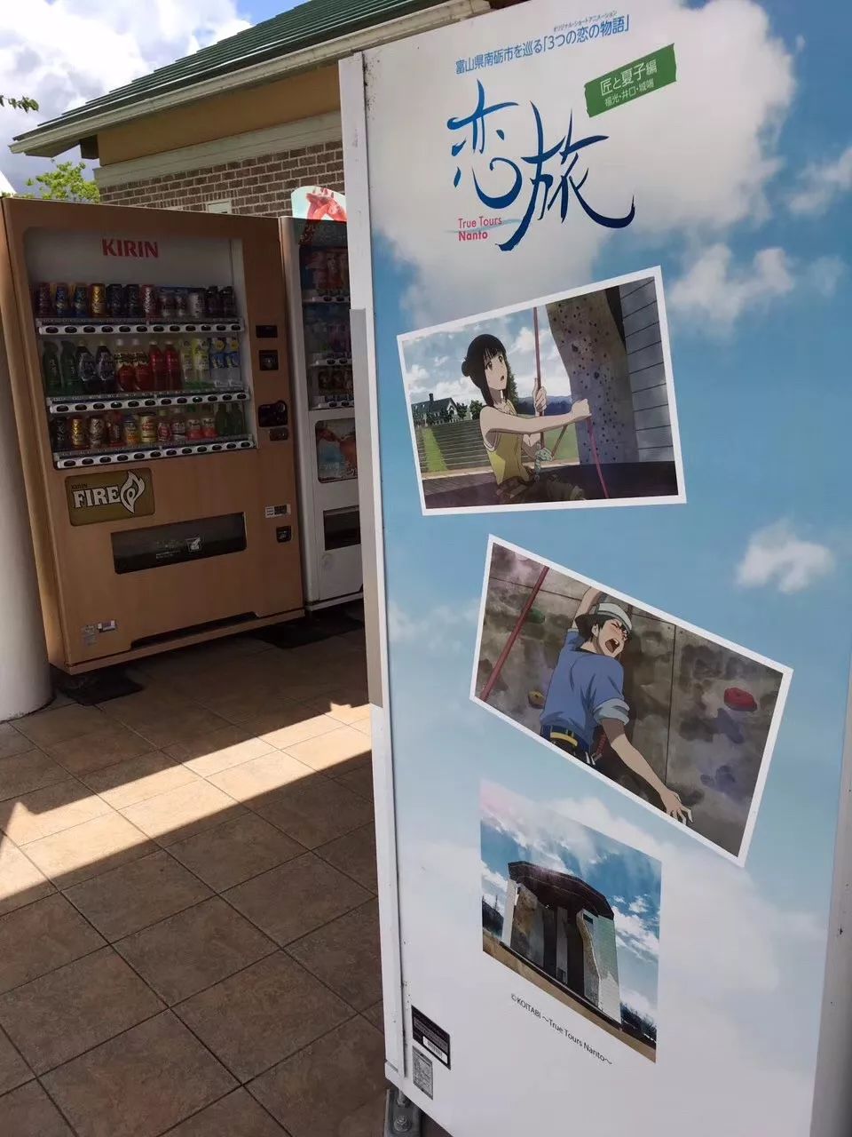 在城端地区随处可见的《恋旅》自动售货机与《樱花任务》巡礼图册和城端站的合影