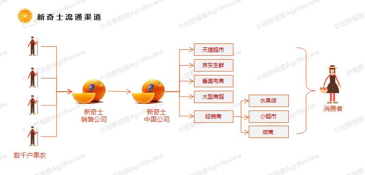 新奇士橙从果农统一收购后由新奇士销售公司运往中国公司,然后通过天猫超市、京东生鲜、几家代理的垂直电商、大型商超直接销售,或者经过经销商再分散到水果店、小超市等销售(包括微商)。