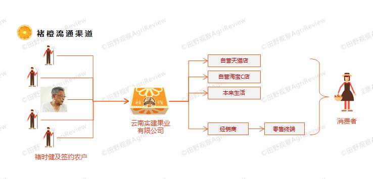 褚橙是统一采收后通过在线上通过天猫淘宝(褚橙水果旗舰店、实建水果专业店、实果纪、褚氏新选旗舰店)和本来生活网销售,在线下由经销商下发到各个零售终端销售。