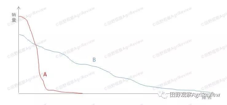 也就是说标准的澳洲脐橙销量基本上集中在天猫超市,其他店铺很少销售(分布如图中的A型曲线);而非标准赣南脐橙虽然有几个大的商家是数万单销量,但集中效应不明显(分布如图中的B型曲线)。