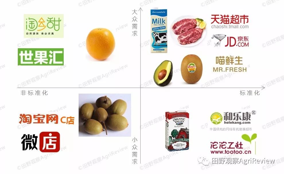 第一象限是标准化大众需求的农产品,像上面提到的新奇士橙,澳洲牛排、佳沛奇异果、墨西哥牛油果等。这类产品标准化,消费者在哪个渠道购买都一样,这种情况下,拥有规模和流量优势的大电商(如天猫超市)自然能够提供更好的价格和服务。