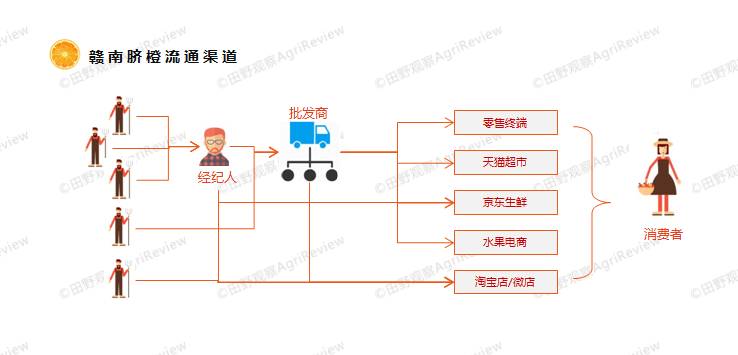赣南脐橙的流通渠道就复杂多了。传统的销售是从农户到农产品经纪人,再经过层层的批发商,最后通过线下零售终端销售。还有是农户、经纪人或批发商供货给电商(天猫、京东或垂直生鲜电商),由电商直营给消费者。也有农户或经纪人自己开淘宝店或微店销售的。