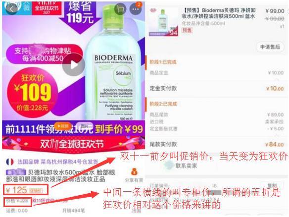 利用专柜价、双十一狂欢价两套(甚至多套)价格概念打太极,混淆视听,这是最主要的路子,同时也是阿里官方给卖家留下的操作口子。