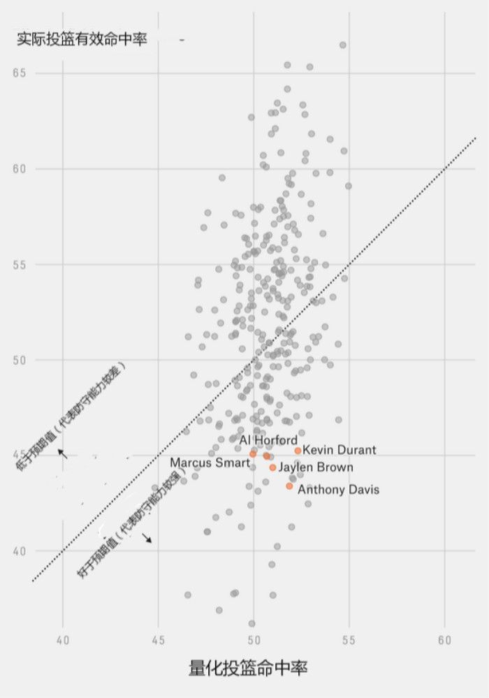 我们之前曾经用过这样的算法,但是这一次我们的计算做了一些调整,将投篮者的因素也考虑了进去。这也就意味着防守投篮较差的球员并不会使一名防守不佳的球员数据更好,而防守超级球星也不会让一名平均水准以上的防守球员数据变差。