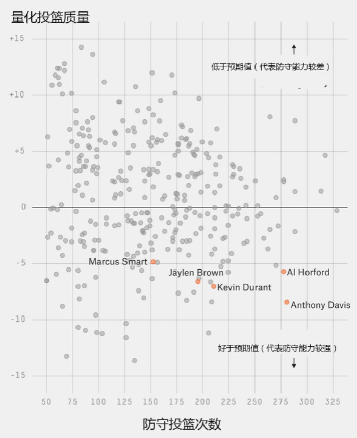但是即便有着这样的局限性,这样的算法依然还是一个考量谁是本赛季最佳防守球员的一个很好的方法,其中有一些球员脱颖而出: