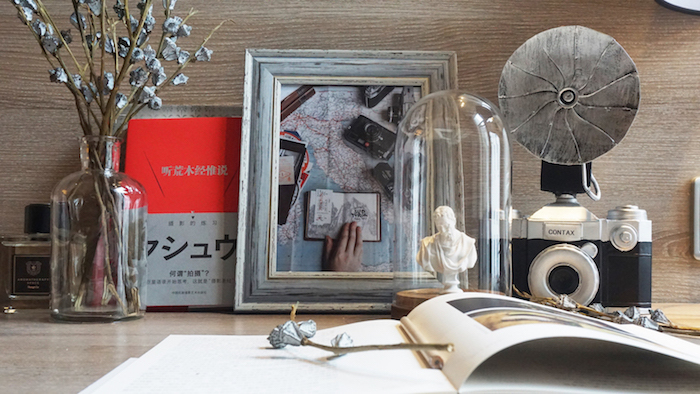 “野生摄影师”房间被布置成了深灰、藏青和墨绿的高级冷色调,零散堆着摄影相关书籍,靠枕和小摆件也做成了相机形状,屋里还架着一台老相机。