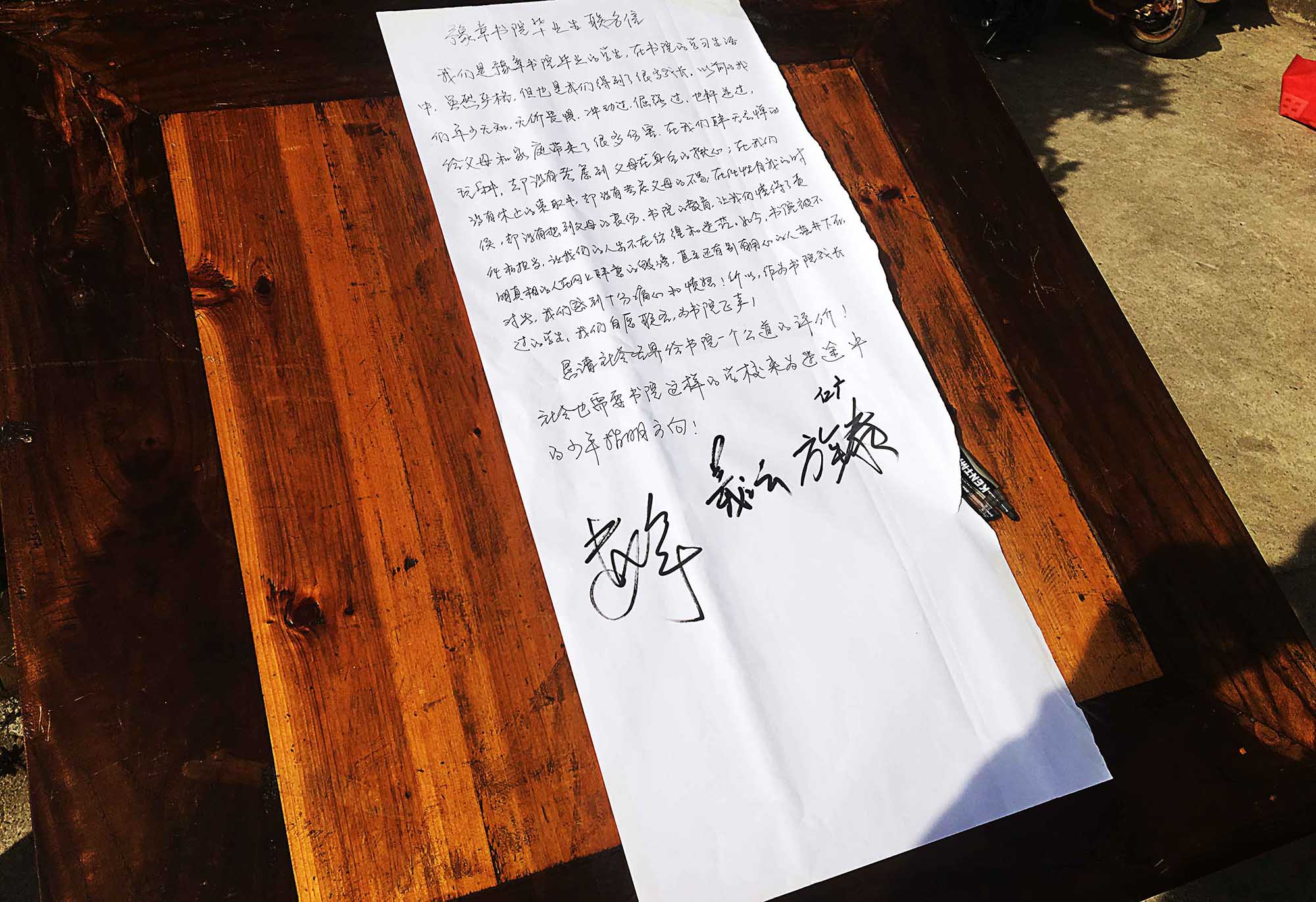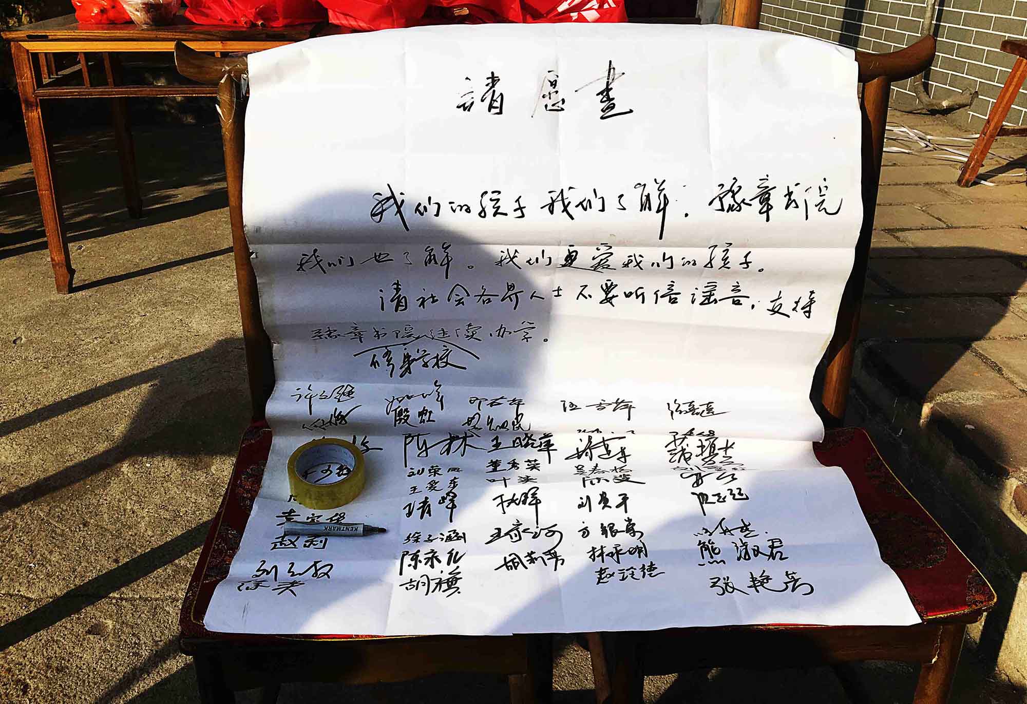 在场的家长与徐母类似想法的不在少数。还有家长自制横幅、喊口号,签下请愿书支持豫章书院继续办学。他们坚持,“网上说的都是谣言,我们不相信学校会体罚学生。”