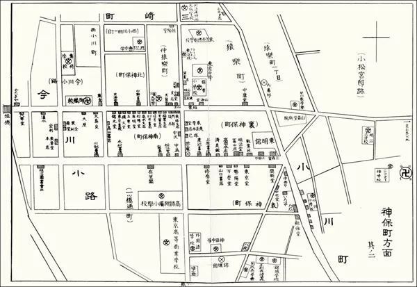 当年黄尊三、周作人逛的书店基本位于神保町北一带,它们大多已经在1913年的神田大火中化为灰烬。重建时各书店纷纷迁址于神保町南,据鹿岛茂分析这主要有三个原因。首先是神保町南开发较晚,地价便宜,适合书店这种小本经营;其次是神保町南的古书店受灾较轻,从产业集聚的角度来看比原地重建更为有利。最后一个原因则是书店业的特殊情况导致的:为了朝向主路靖国大道,神保町南的店面大多坐南朝北,和坐北朝南的神保町南店面相比,每天受到阳光直晒的时间更短,有利于保存书籍。