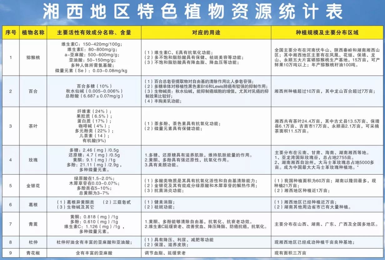 吉首大学武陵山区发展研究院副院长陈功锡介绍,湘西所在的武陵山片区有着极为丰富的生物资源,记录在册的植物多达4000余种,是整个欧洲的1.5倍,药用植物3000多种,占到湖南省的80%。在过往的研究中,已发现并能够用于化妆品的植物资源已有200余种,猕猴桃、杜仲、青蒿、银杏等是其中的优秀代表。他进一步表示,在对湘西丰富的自然资源感到自豪的同时,也会为这些资源未能充分被利用而感到遗憾。