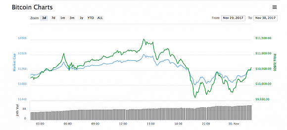 此消息一出,根据CoinMarketCap数据,比特币价格在周三一度上扬到11500美元一币,而仅仅在一天之前,比特币价格首超10000美元。