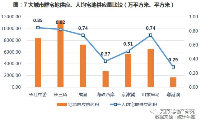 过去5年间,长三角城市群的宅地供给量最多,高达11392万平方米,供给总量最少的是粤港澳城市群,仅1694万平方米。从各城市群的人均宅地供给量上来看,长江中游城市群的人均宅地供给量是最多的,约0.85平方米,其次是长三角城市群,约0.82平方米,人均宅地供给面积最少的是粤港澳城市群,仅0.29平方米。由此可以看出:长三角城市群、长江中游城市群无论从宅地供给总量上看还是人均宅地供给量上看,都居于7大城市群前两位,供地相对较为充裕。粤港澳城市群的宅地供给总量和人均宅地供给量都居于末位,宅地供给上相对较为局促。