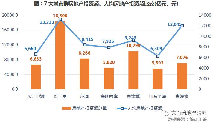 长三角城市群房地产投资额最多,高达18300亿元,其次是京津冀城市群,约10299亿元,居于第三位的是成渝城市群,约8366.5亿元,总投资最少的城市群是山东半岛城市群,仅5592.8亿元。从各城市群的人均房地产投资额上来看,长三角城市群人均房地产投资额最高,约13233元,其次是粤港澳城市群,约12045元,居于第三位的是京津冀城市群,约11726元,人均房地产投资额最少的是山东半岛城市群,仅6309元。由此可以看出:长三角城市群无论从房地产投资额总量上看还是人均房地产投资额上看,都居于7大城市群的首位,市场预期较好。山东半岛城市群的房地产投资额总量和人均房地产投资额都居于末位,市场预期不足。