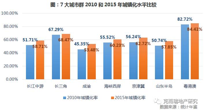 从各城市群近5年城镇化率增长情况来看,增长最快的是成渝城市群,5年增长了8个百分点,增长最少的长三角城市群和粤港澳城市群,增长了大约1个百分点。由此可以看出:粤港澳城市群和长三角城市群城镇化率较高,但城镇化率增长缓慢,加上产业结构的调整,人口导入趋势放缓,增量住房需求后劲不足。城镇化率最低的成渝城市群城镇化增长速度最快,增量住房需求有上升空间。