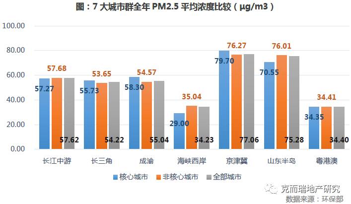 从全年PM2.5平均浓度上看,海峡西岸城市群的全年PM2.5平均浓度最低,约34.23μg/m3,其次为粤港澳城市群,约34.40μg/m3,都低于全国平均值50.2μg/m3。除这两个城市群空气质量整体上处于优的区间(0-35μg/m3),其余城市群的全年PM2.5平均浓度均高于全国平均水平。全年PM2.5平均浓度最高的城市为京津冀城市群和山东半岛城市群两者高达约77μg/m3,处于轻度污染的区间,空气环境质量有待于进一步提升。2015年中国欧盟商会发布《北京建议书》,称北京的空气污染影响了北京的国际形象,阻碍了外国及中国本土专业人士宜居北京。中国欧盟商会的会员企业中,39%认为空气污染是留住人才面临的最大挑战。由此可见,空气质量的确影响着一些高端人才的去留,也间接影响了城市的房地产市场。